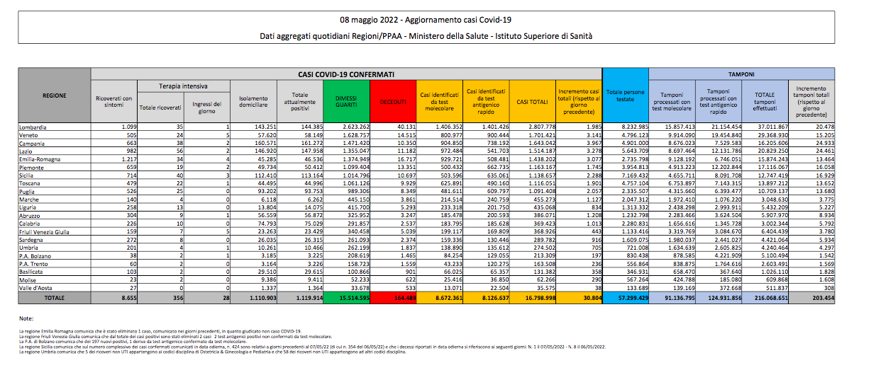 Covid, Italia: il bollettino di domenica 8 maggio