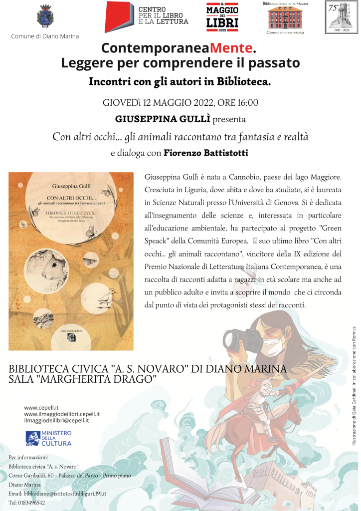 Giovedì 12 maggio, alle ore 16.00, secondo appuntamento del “Maggio dei Libri” presso la Sala “Margherita Drago” della Biblioteca Civica “A.S. Novaro” di Diano Marina con la scrittrice Giuseppina Gullì che presenterà il suo ultimo libro bilingue Con altri occhi… gli animali raccontano, edito da Laura Capone nel 2021.
