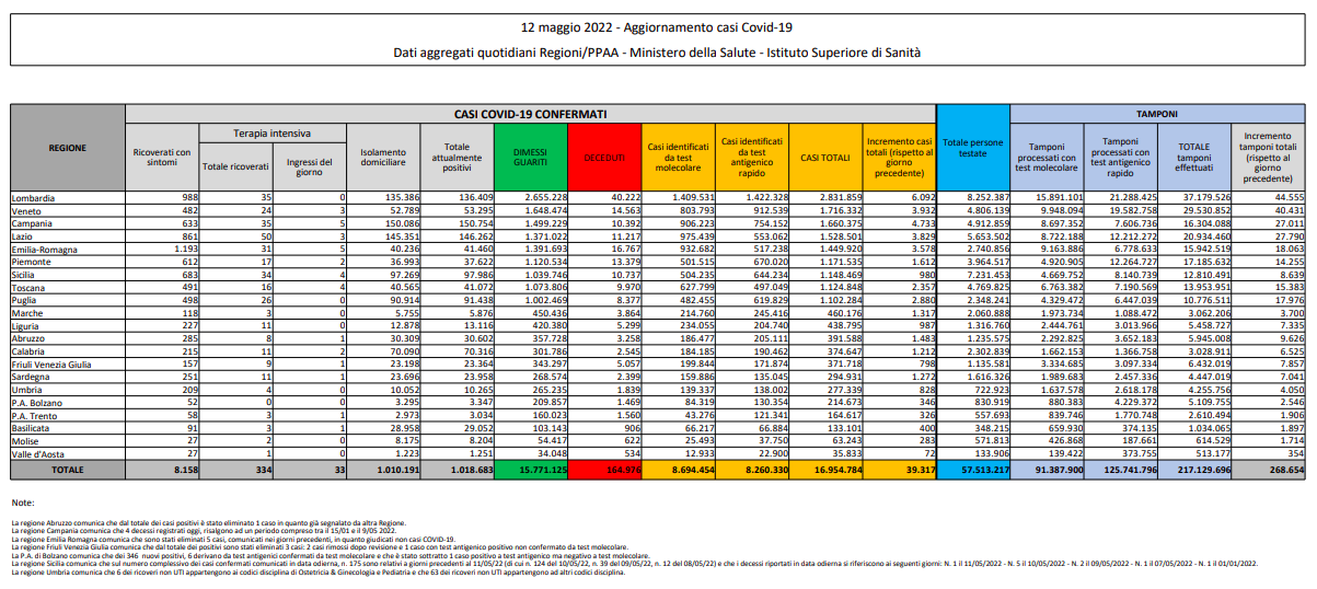 Covid, Italia: il bollettino di giovedì 12 maggio