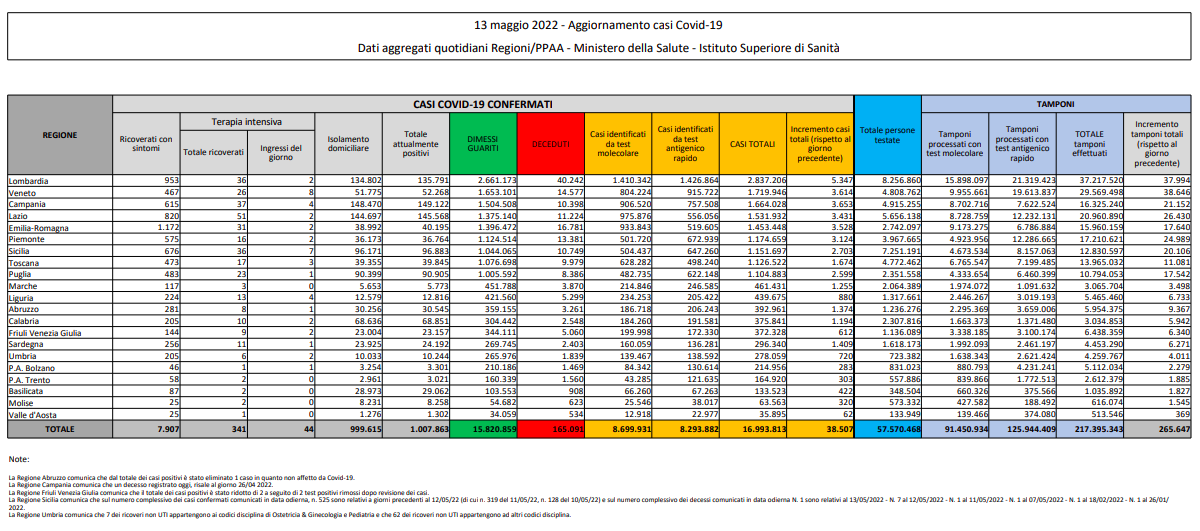 Covid, Italia: il bollettino di venerdì 13 maggio