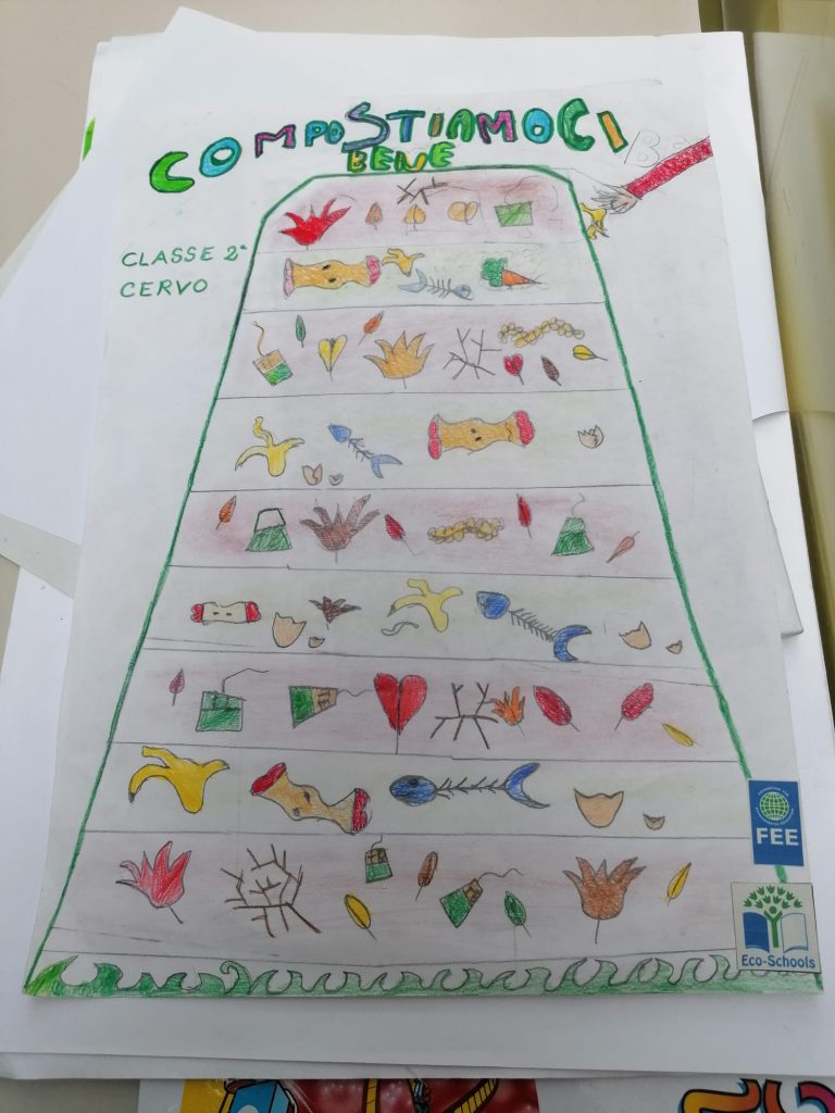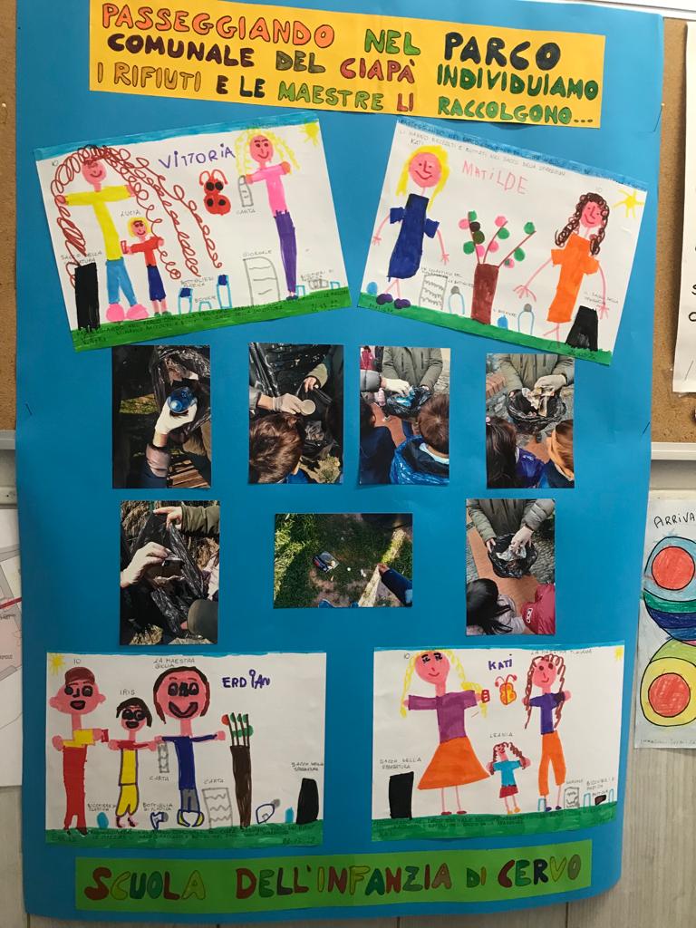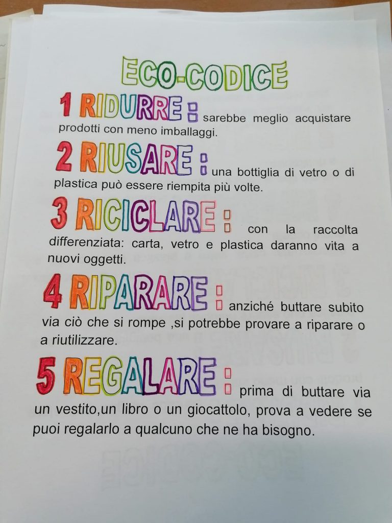 Coinvolgendo le associazioni del territorio – la scuola dell’infanzia ha collaborato con l’asineria Endas del Ciapà e la primaria con l’associazione Informare, raccogliendo e catalogando rifiuti sulla spiaggia – sono stati creati degli Ecocodici in forma di cartelloni con slogan che andranno a sensibilizzare la popolazione sul territorio parlando di grandi temi ambientali, mentre la scuola dell’infanzia ha realizzato decorazioni con materiali di riciclo.