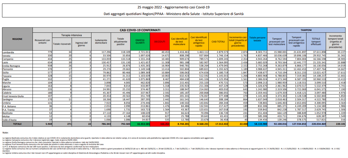Covid, Italia: il bollettino di mercoledì 25 maggio