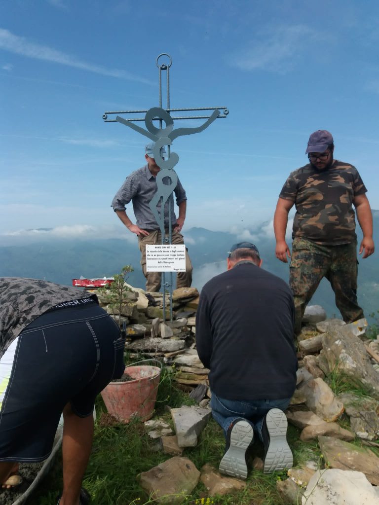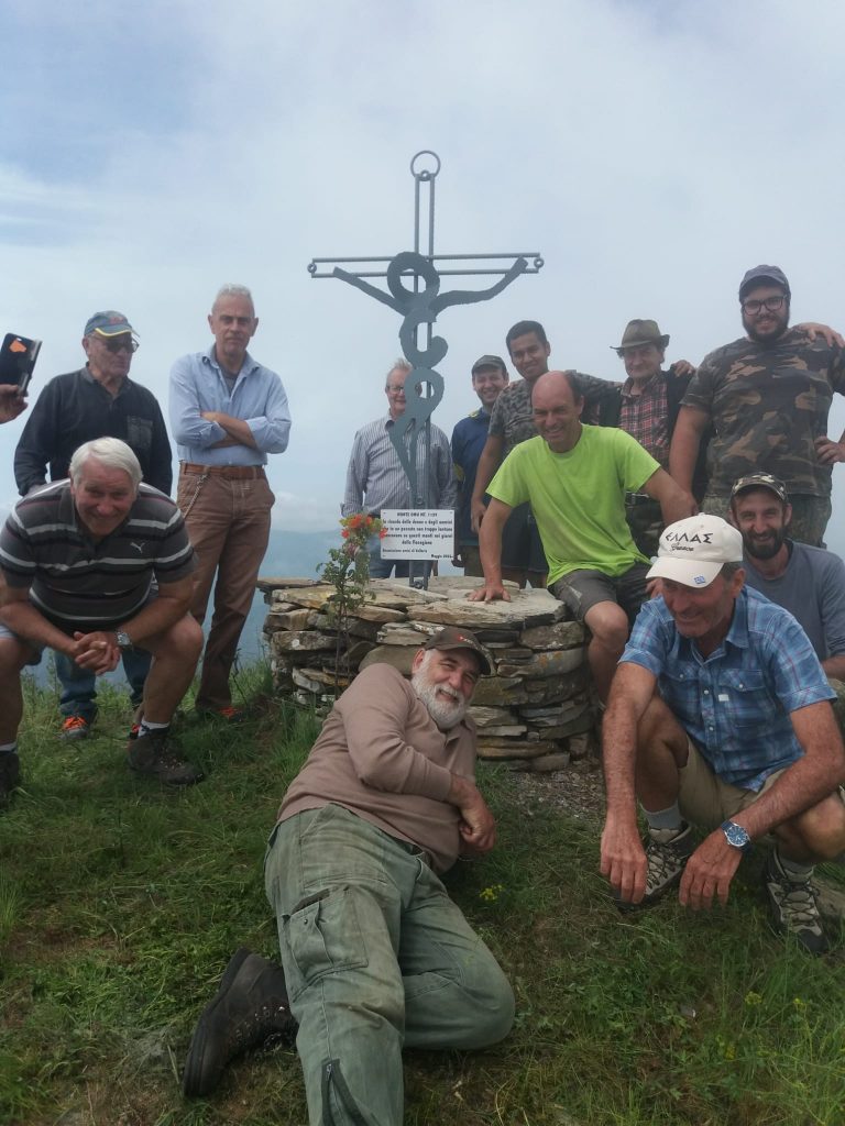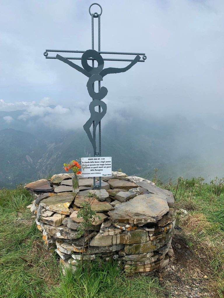 Sulla vetta hanno posto una croce in ferro con la figura stilizzata del Cristo, appositamente realizzata per l’associazione dall’artista Riccardo Cosimo Tomaselli di Diano Marina. La croce é stata posta in ricordo di tutte quelle persone che un tempo si recavano su quei monti e lì rimanevano a lavorare per buona parte dell’estate durante il periodo della fienagione.