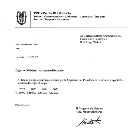 Nell’ultima variazione di bilancio approvata dal consiglio provinciale di Imperia lo scorso 25 maggio c’è anche una voce, passata inosservata, che riguarda il noleggio di un’auto elettrica.