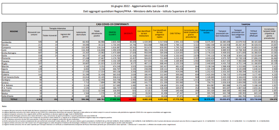 Covid, Italia: il bollettino di giovedì 16 giugno