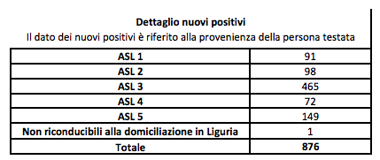 In Liguria i nuovi positivi sono 876 (ieri erano 863). Ecco il dettaglio dei nuovi positivi riferito alla residenza della persona testata: