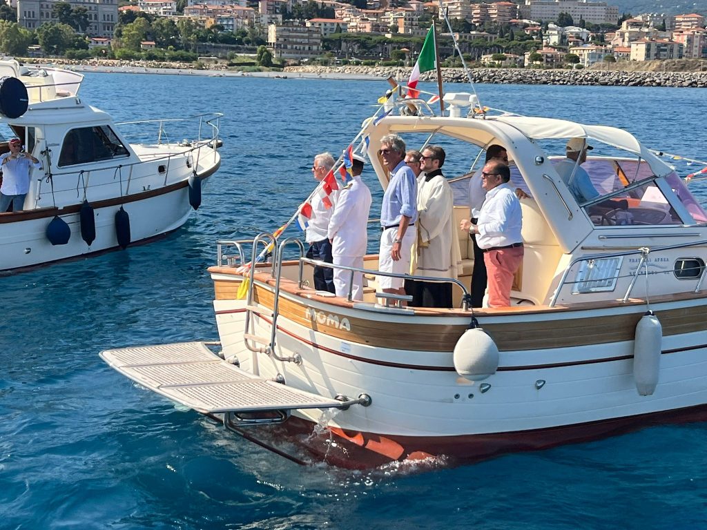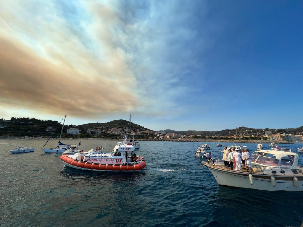 Una processione di barche si è mossa dal porto di Porto Maurizio, fino al porto di Oneglia e al ritorno, nel tratto di mare di fronte al Palazzo comunale, è avvenuta la deposizione in mare di una corona di alloro, preceduta dalla benedizione e seguita dal tradizionale suono delle sirene delle barche presenti.