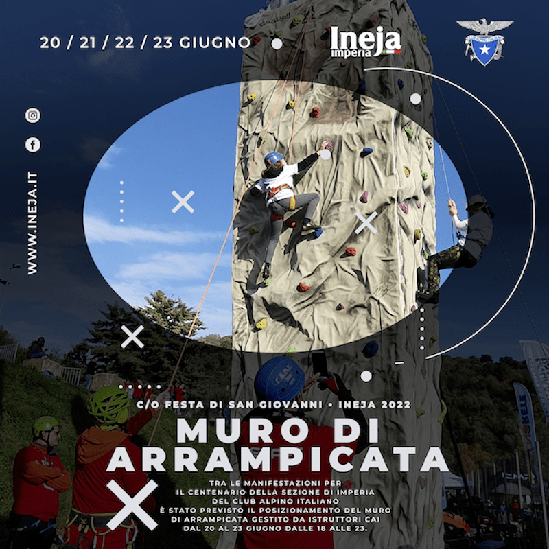 Alle 17.00 apertura degli stands di MercantIneja, dove troverete una grande varietà di prodotti, e dalle ore 18.00 fino alle 23.00 in via del Cantiere, muro di arrampicata gestito da istruttori C.A.I. (Club Alpino Italiano), in occasione dei 100 anni della sede di Imperia.