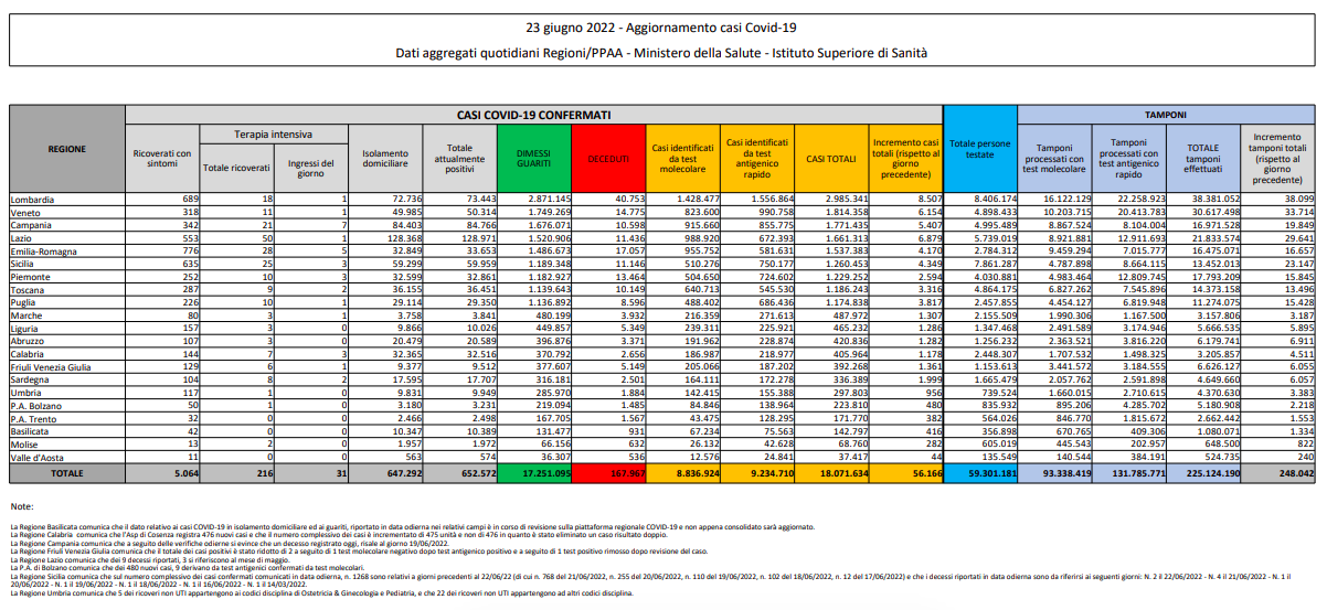 Covid, Italia: il bollettino di giovedì 23 giugno