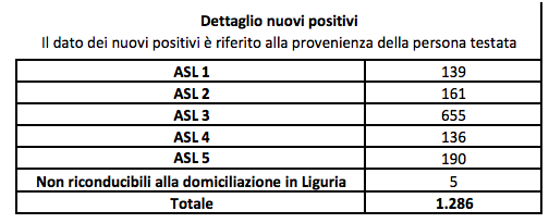In Liguria i nuovi positivi sono 1.286 (ieri 1.174). Ecco il dettaglio dei nuovi positivi riferito alla residenza della persona testata: