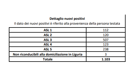 In Liguria i nuovi positivi sono 1.103 (ieri 962). Ecco il dettaglio dei nuovi positivi riferito alla residenza della persona testata: