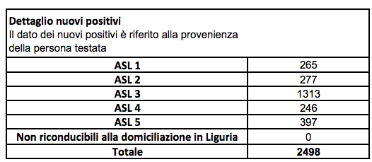 In Liguria i nuovi positivi sono 2.498 (ieri 493). Ecco il dettaglio dei nuovi positivi riferito alla residenza della persona testata: