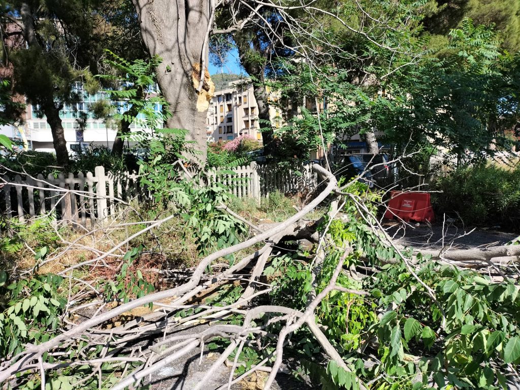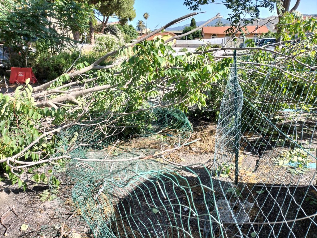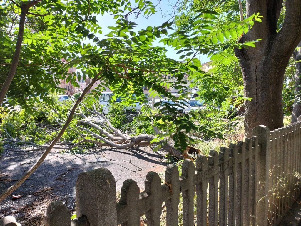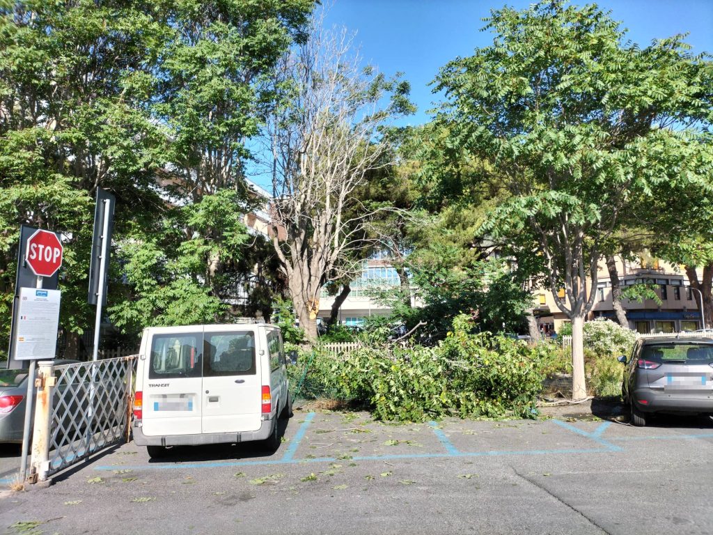 Particolarmente significante la caduta di una parte di albero in via Parini. Come si evince dalle immagini, i rami dell’albero caduto hanno divelto la recinzione a margine del parcheggio, senza però colpire auto o persone.