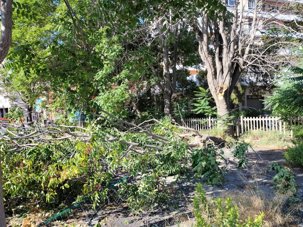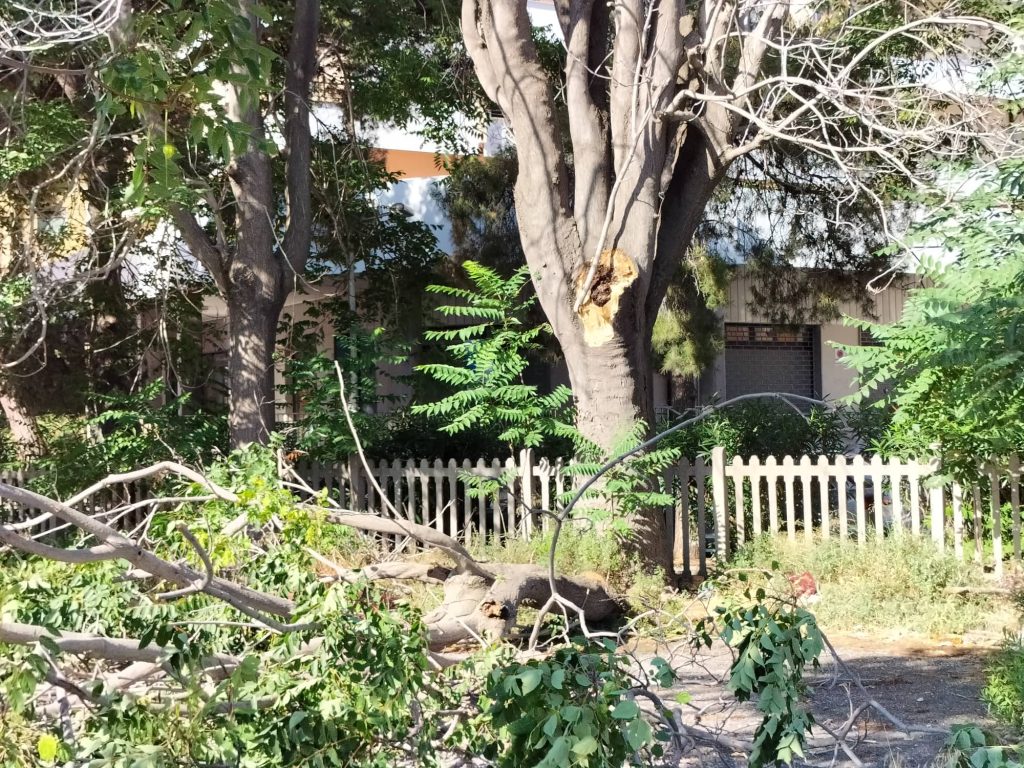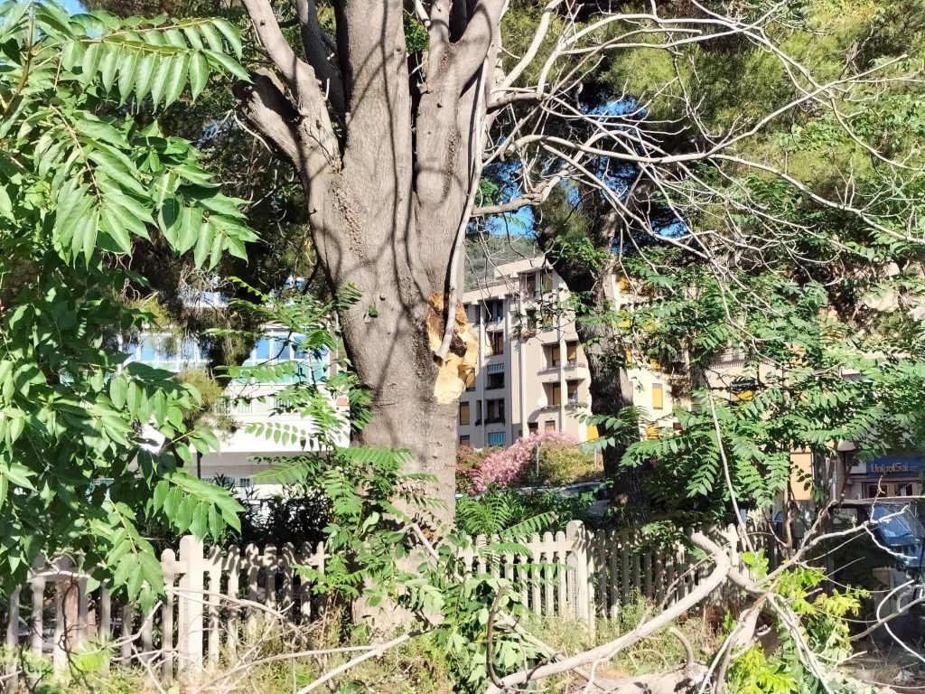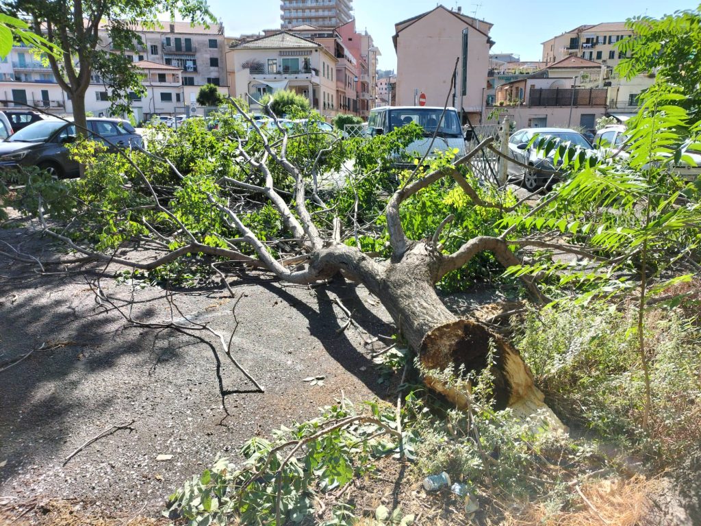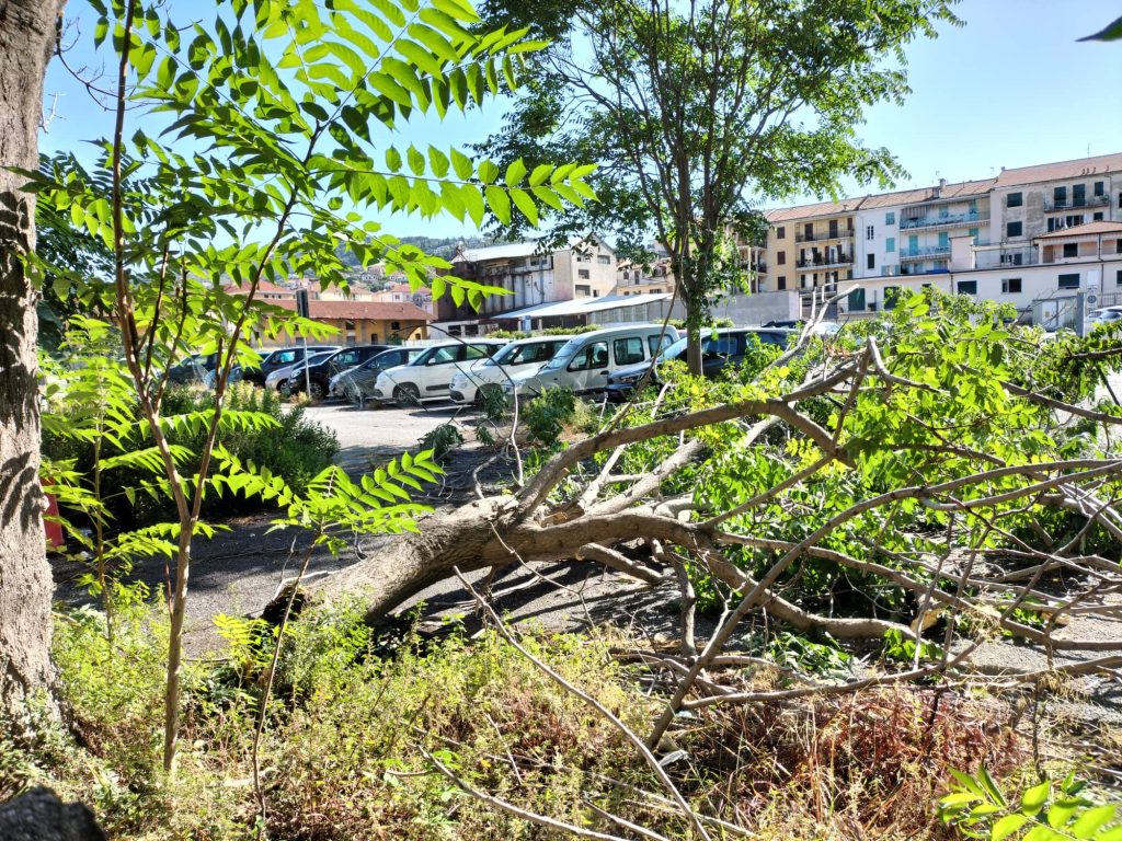 Particolarmente significante la caduta di una parte di albero in via Parini. Come si evince dalle immagini, i rami dell’albero caduto hanno divelto la recinzione a margine del parcheggio, senza però colpire auto o persone.