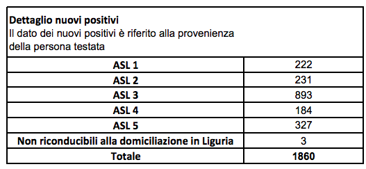 In Liguria i nuovi positivi sono 1860 (ieri 1.686). Ecco il dettaglio dei nuovi positivi riferito alla residenza della persona testata: