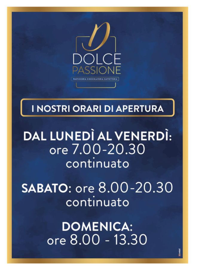 La caffetteria, pasticceria e cioccolateria “Dolce Passione”, sotto la guida della titolare Andreea Maria, da anni nel mondo della ristorazione, offre caffè e beverage accompagnati da deliziosi prodotti di pasticceria artigianale tradizionale e moderna, fresca e secca, affidata alle sapienti mani dei pasticceri Alessia e Diego.