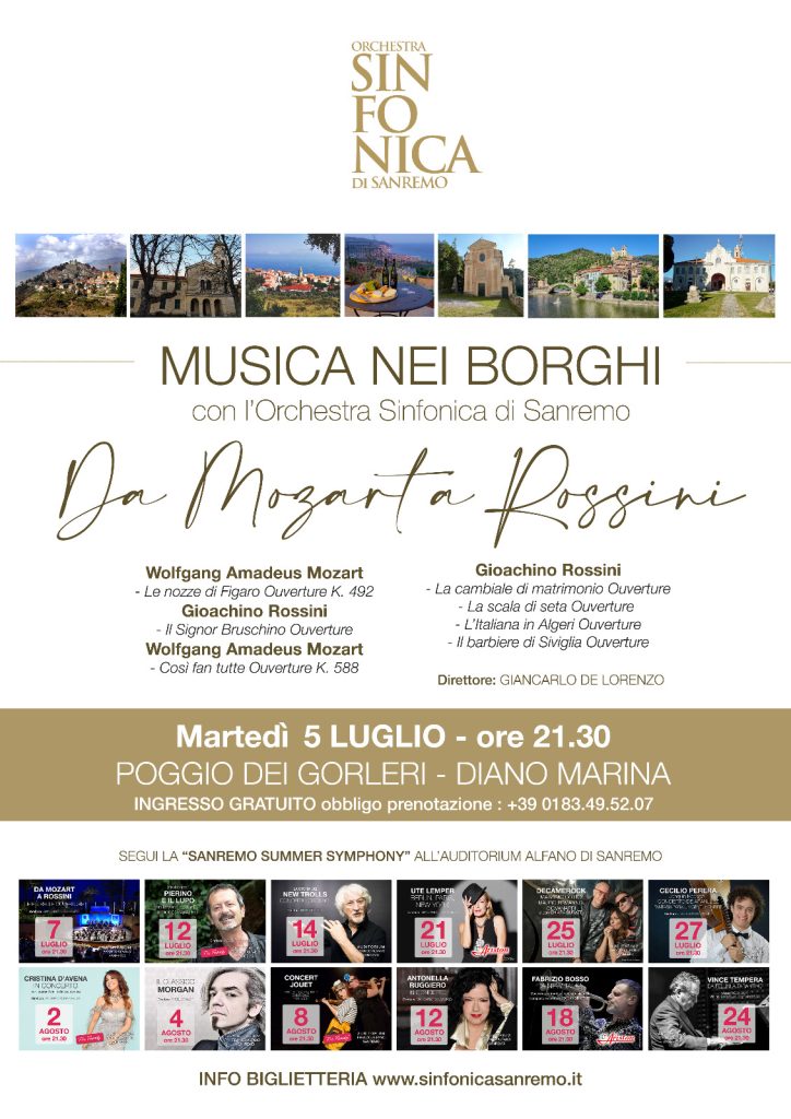 L’Orchestra Sinfonica di Sanremo si esibirà in un concerto di musica classica intitolato “Musica nei Borghi”, con la direzione di Giancarlo De Lorenzo, che spazierà dalle opere di Wolfgang Amadeus Mozart a quelle di Gioacchino Rossi.