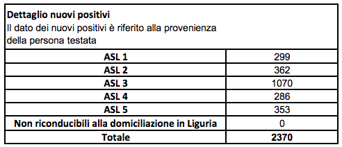 In Liguria i nuovi positivi sono 2.370 (ieri erano 2.299). Ecco il dettaglio dei nuovi positivi riferito alla residenza della persona testata: