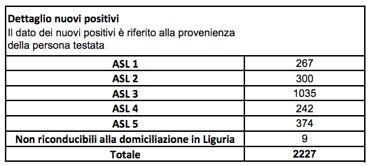 In Liguria i nuovi positivi sono 2.227 (ieri erano 2.370). Ecco il dettaglio dei nuovi positivi riferito alla residenza della persona testata: