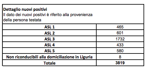 In Liguria i nuovi positivi sono 3.819 (ieri erano 871). Ecco il dettaglio dei nuovi positivi riferito alla residenza della persona testata: