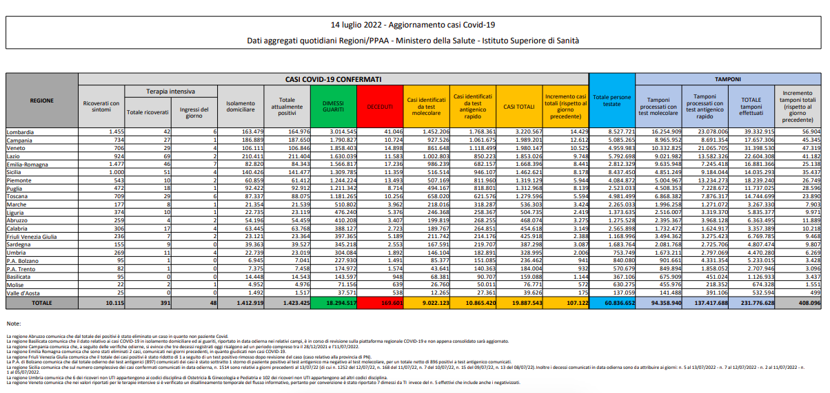 Covid, Italia: il bollettino di giovedì 14 luglio