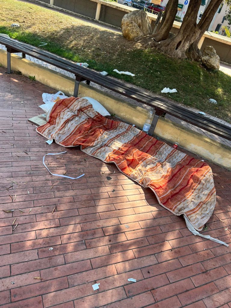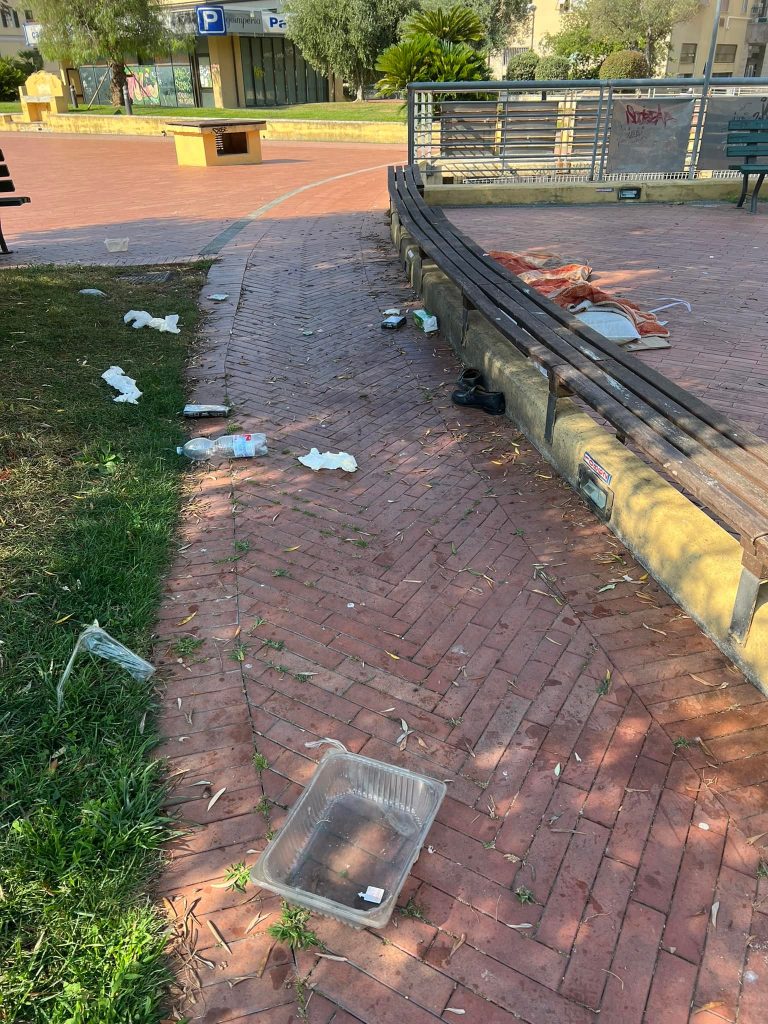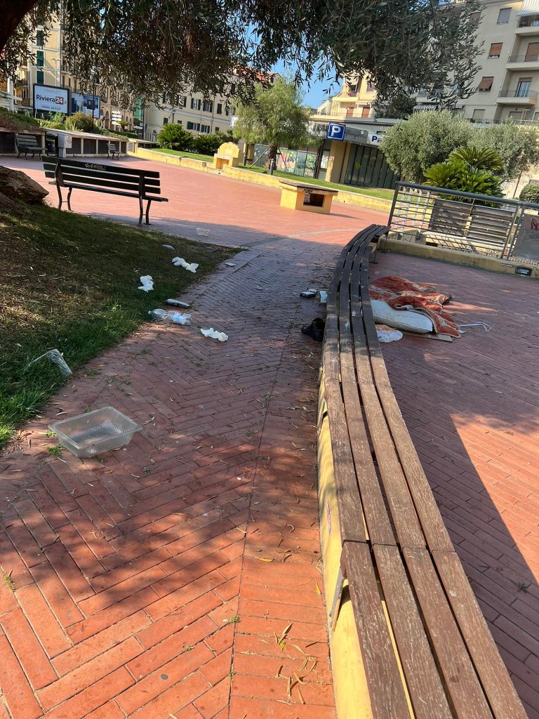 Immondizia di ogni genere, avanzi di cibo e perfino un giaciglio per dormire: è il degradante spettacolo che si può vedere nei Giardini Toscanini di Oneglia.