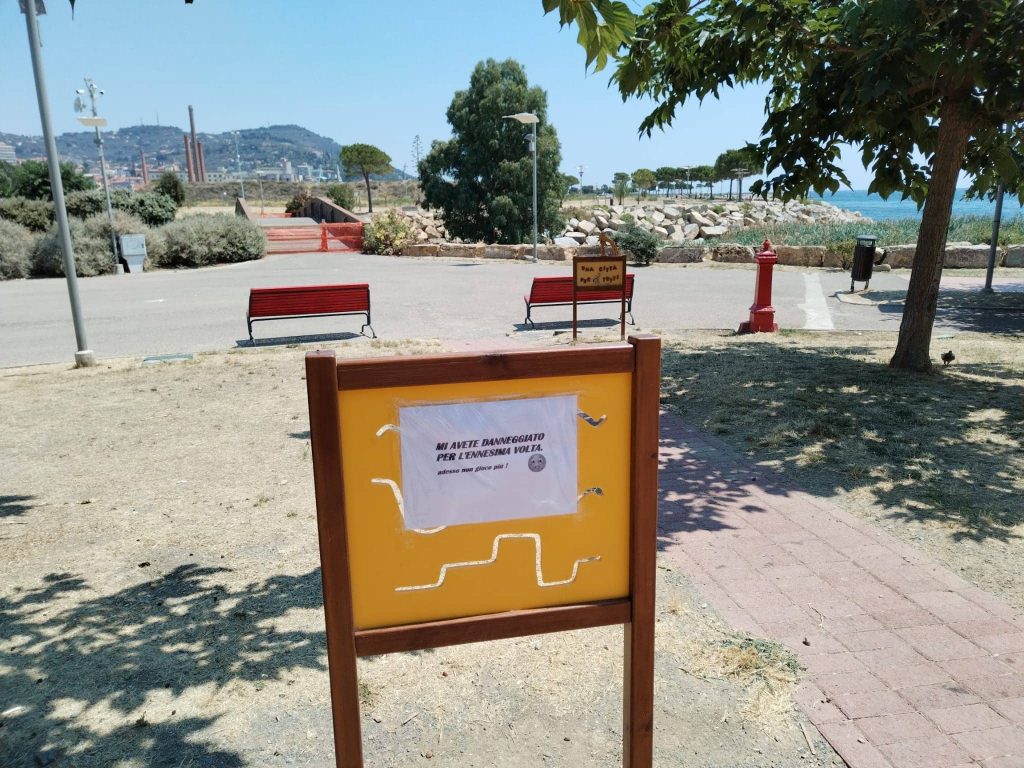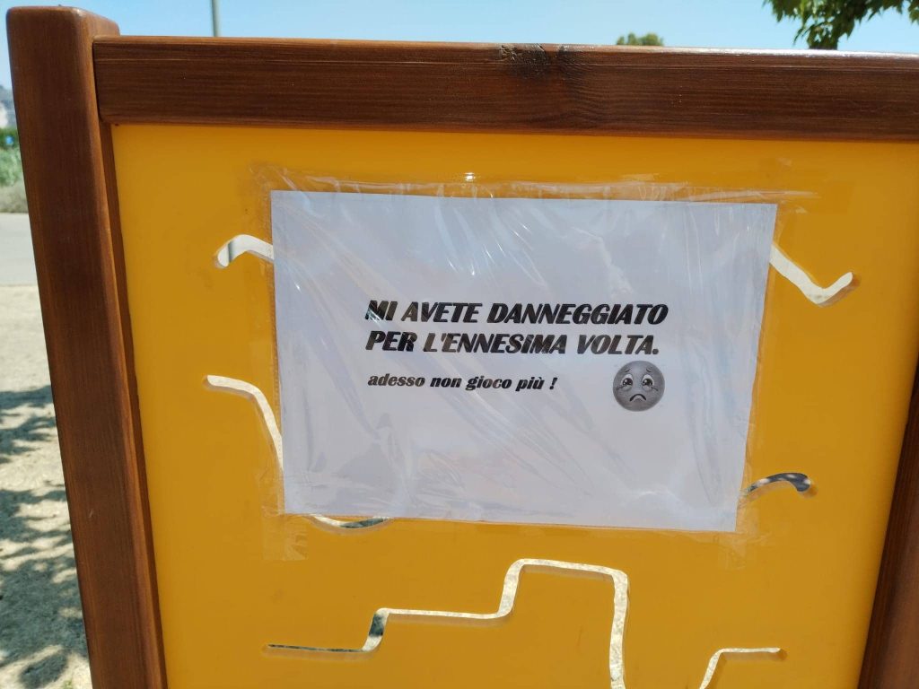 Invece di riparlo subito, come fatto finora, l’Associazione ha deciso di lasciarlo rotto, affiggendo un cartello riportante la scritta “Mi avete danneggiato per l’ennesima volta, adesso non gioco più”.