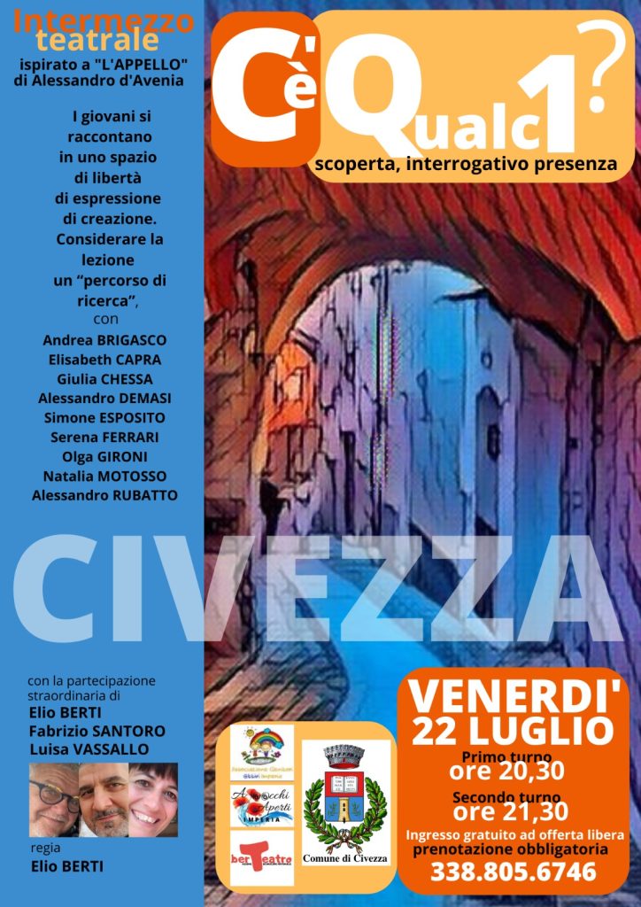 Siamo davvero felici di presentarvi l’evento di venerdì prossimo, 22 luglio, a Civezza. Abbiamo deciso di riproporre lo spettacolo teatrale del convegno capovolto “la scuola che vorrei” tenutosi il 28 maggio all’università e portato in scena da 11 studenti che hanno affrontato un laboratorio teatrale della durata di due mesi (finanziato da Aga) con la guida esperta del regista teatrale Elio Berti e dell’aiuto regista Luisa Vassallo, ormai due amici per noi e soprattutto per i ragazzi.