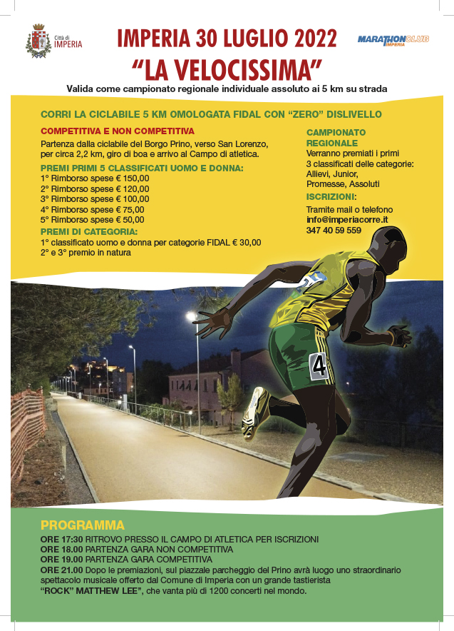 Sabato 30 luglio arriva “La Velocissima“, gara di corsa sul tracciato della nuova pista ciclabile. Per dare la possibilità di far conoscere lo splendido tratto a tanti appassionati della Corsa, si organizza a contorno del Campionato Regionale la NON COMPETITIVA, dove verrà comunque misurato il tempo impiegato e per i primi 100 iscritti una bellissima maglietta ricordo.