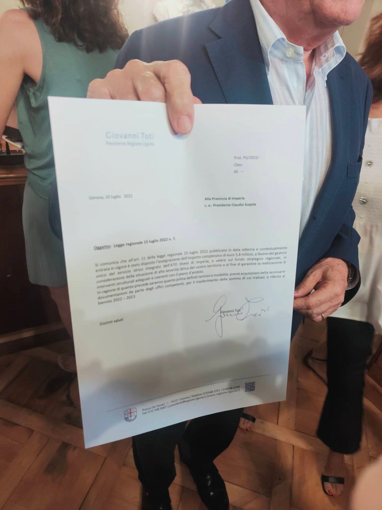 Oggi ci è stata consegnata e firmata la lettera del Presidente Toti, che comunica alla Provincia un finanziamento da 5,8 milioni di euro affinchè, in attesa del Decreto ministeriale governativo per il raddoppio del Roya con la nuova condotta, si possano iniziare subito i lavori per i due lotti già progettati e autorizzati, tra Imperia e Diano Marina.