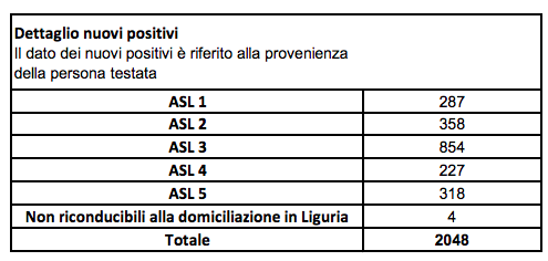 In Liguria i nuovi positivi sono 2.048 (ieri erano 2.189). Ecco il dettaglio dei nuovi positivi riferito alla residenza della persona testata: