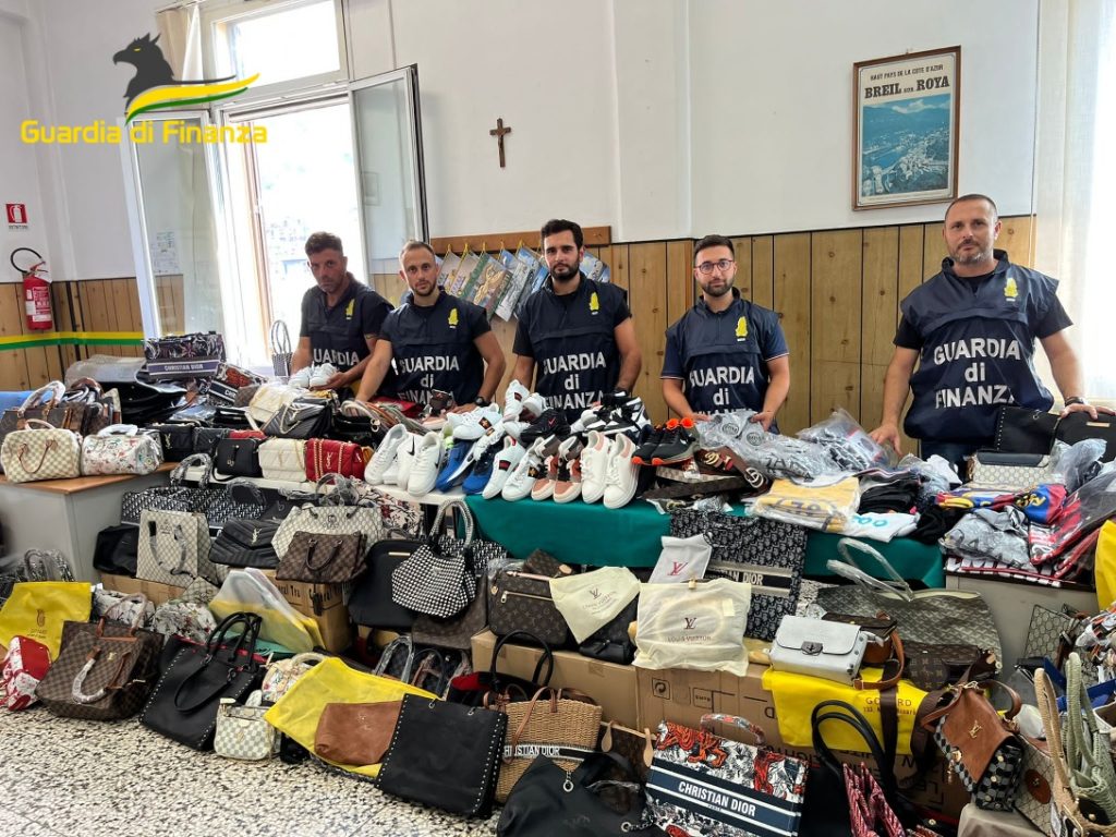 Incrementate anche le attività volte alla repressione del fenomeno della contraffazione con l’esecuzione di mirati controlli. In particolare si evidenzia il servizio recentemente svolto a Ventimiglia, nella zona antistante l’area riservata al “Mercato del venerdì“, ove le Fiamme Gialle della locale Compagnia hanno rinvenuto e sequestrato, a 12 soggetti senegalesi, oltre 900 articoli d’abbigliamento, verosimilmente contraffatti, pronti per essere commercializzati illecitamente tra le bancarelle del noto mercato settimanale.