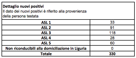 In Liguria i nuovi positivi sono 330. Ecco il dettaglio dei nuovi positivi riferito alla residenza della persona testata: