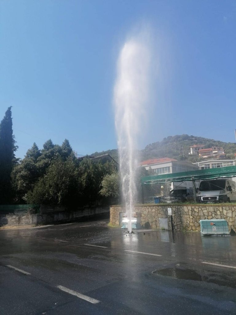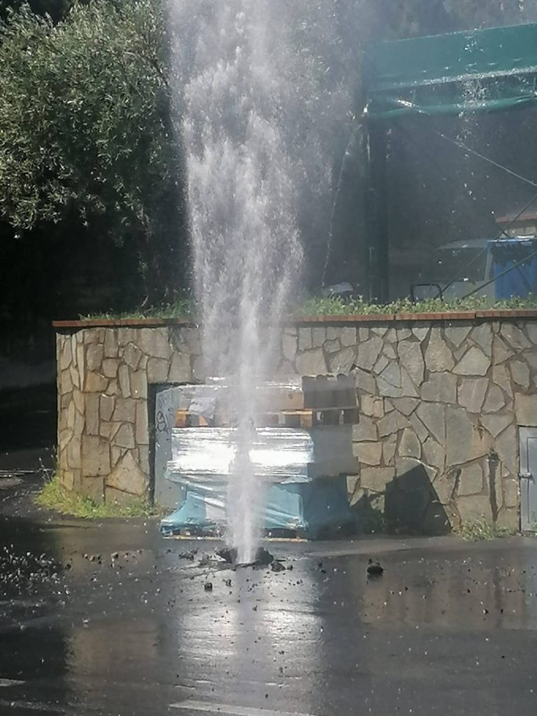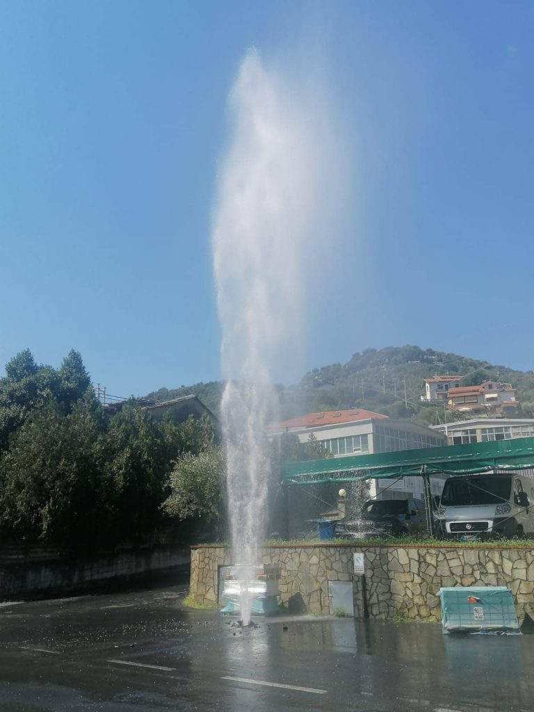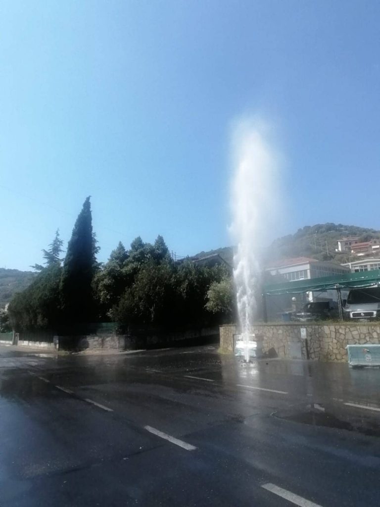 Acquedotto sempre più al collasso a Imperia. Questa mattina è esploso un tubo sull’Argine Destro, all’altezza dell’Azienda Fratelli Maglio, e dall’asfalto è scaturito un geyser alto alcuni metri che ha allagato la strada.