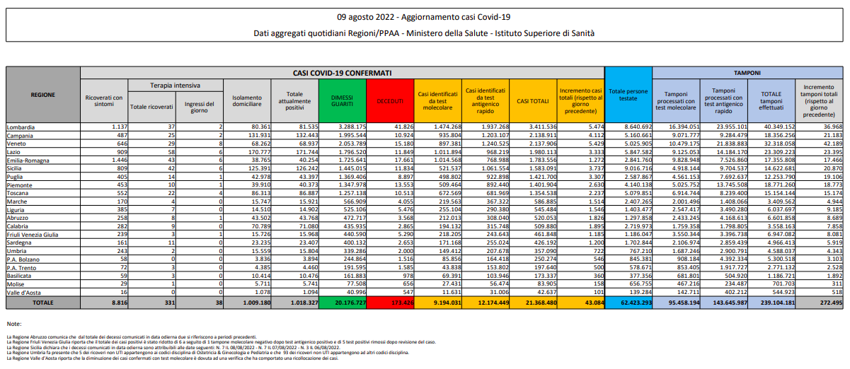 Tutte le regioni d’Italia hanno fatto registrare almeno un nuovo contagio, la Valle d’Aosta risulta la meno colpita, con 101 casi.