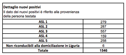 In Liguria i nuovi positivi sono 1.546 (ieri erano 330). Ecco il dettaglio dei nuovi positivi riferito alla residenza della persona testata: