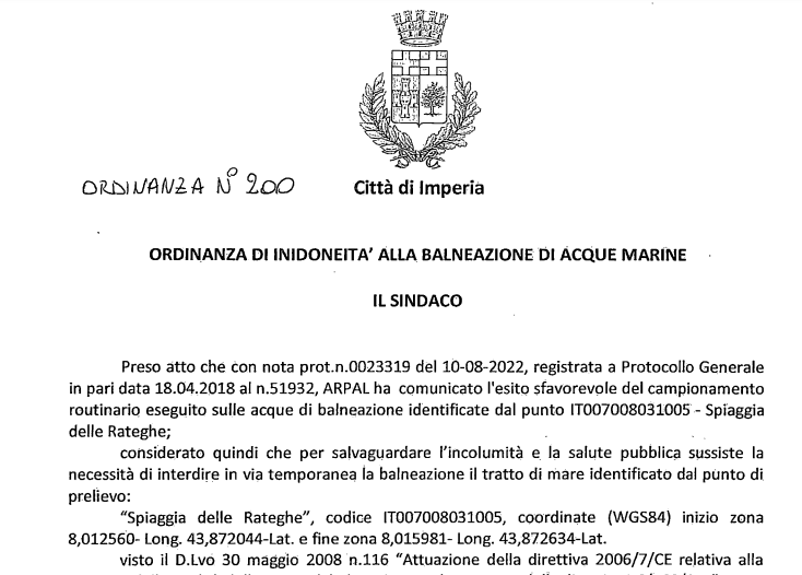 Scatta il divieto di balneazione dopo che i prelievi condotti da Arpal hanno evidenziato valori fuori norma nel tratto di mare denominato “Spiaggia delle Rateghe“. Il Sindaco di Imperia Claudio Scajola ha firmato l’ordinanza.