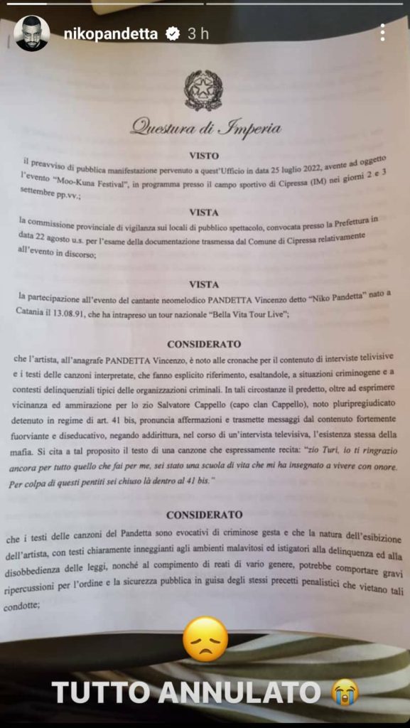 “I testi delle canzoni del Pandetta sono evocativi di criminose gesta e la natura dell’esibizione dell’artista, con testi chiaramente innegianti agli ambienti malavitosi e istigatori alla delinquenza e alla disobbedienza delle leggi, nonchè al compimento di reati di vario genere, potrebbe comportare gravi ripercussioni per l’ordine e la sicurezza in guisa degli stessi precetti penalistici che vietano tali condotte”. Così recita l’ordinanza emessa dalla Questura di Imperia con la quale viene annullato il concerto di Niko Pandetta che era in programma nell’ambito dell’evento Moo-Kuna, il festival che si svolgerà a Cipressa il weekend del 2-3 settembre.