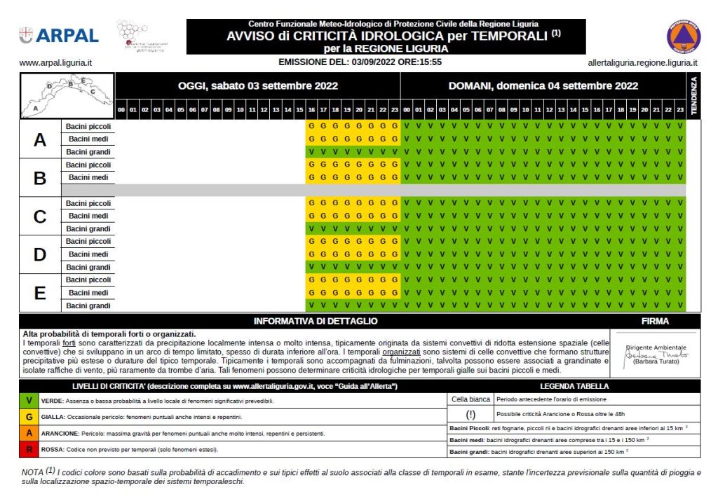 L’Arpal ha deciso di prolungare ulteriormente l’allerta meteo gialla per piogge e temporali, nell’imperiese, come nel resto della regione Liguria, sino alle ore 24 di oggi, sabato 3 settembre.