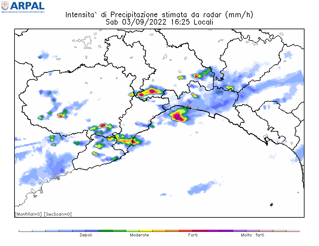 Si segnalano intensità molto forti a Madonna delle Grazie (Genova) con 55.2 millimetri in un’ora, Lerca (Cogoleto, Genova) con 52.2 di cui 31.4 in 15 minuti, Sciarborasca (Cogoleto, Genova) con 50.8; intensità forti a Santa Margherita Ligure (Genova) con 48.4 millimetri in un’oradi cui 26.6 in 15 minuti. Alpe Vobbia (Genova) con 40.2, Monte Pennello (Genova) con 30.0. Al momento è Madonna delle Grazie ad avere la cumulata totale maggiore con 78.8 millimetri.