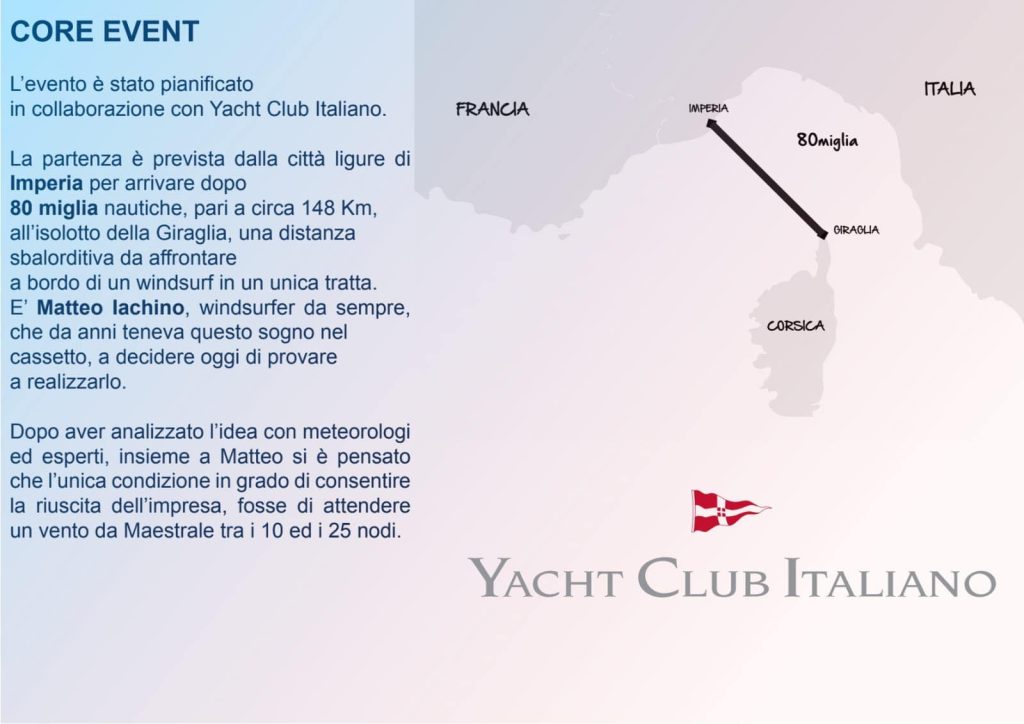 “E’ un onore per noi ospitare ed un campione indiscusso del calibro di Matteo Iachino – Afferma il presidente del circolo ASD La Rabina di Imperia Andrea Grande – Questo evento sportivo da guinness dei primati è anche un richiamo al rispetto del mare da parte di tutti. Ricordiamo che nel palmares di Iachino ci sono un titolo di campione del mondo di windsurf nella disciplina dello slalom ed nove titoli di vice campione del mondo.