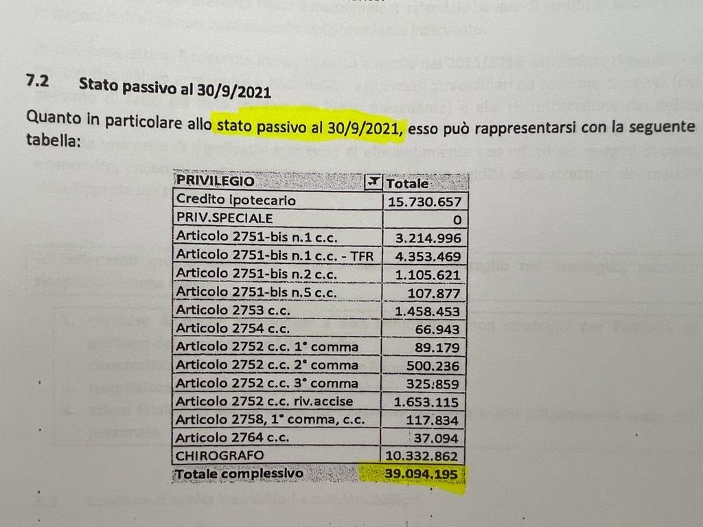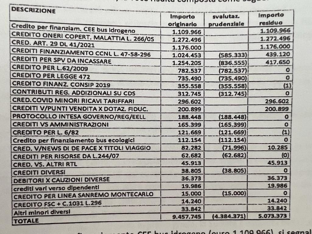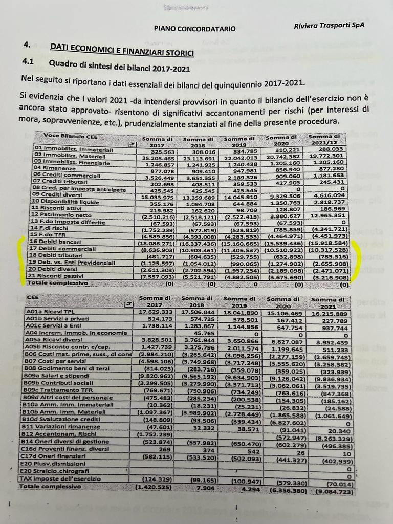 Lo stato passivo di Riviera Trasporti al 30 settembre 2021 è in totale pari a 39 milioni di euro.