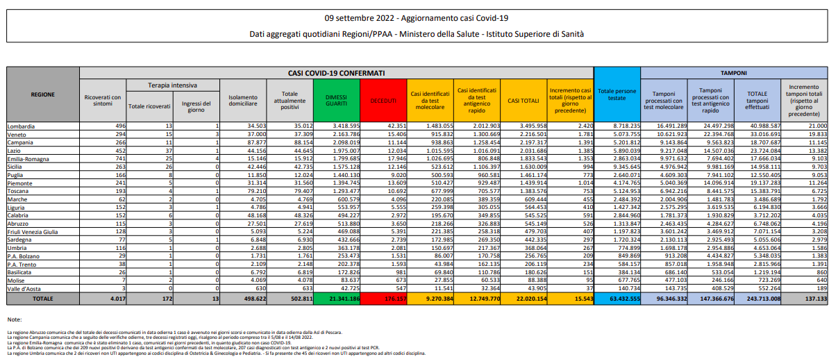 Covid, Italia: il bollettino di venerdì 9 settembre