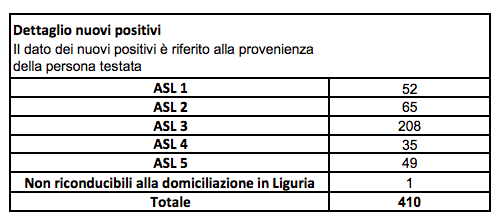 In Liguria i nuovi positivi sono 410 (ieri erano 440). Ecco il dettaglio dei nuovi positivi riferito alla residenza della persona testata: