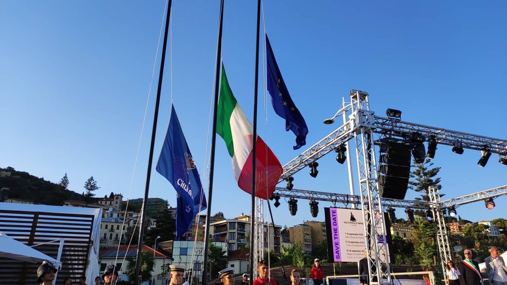Cerimonia di chiusura in Calata Anselmi per l’edizione 2022 del Raduno delle Vele d’Epoca, alla presenza delle autorità civili e militari locali, compreso il presidente della Regione Giovanni Toti.