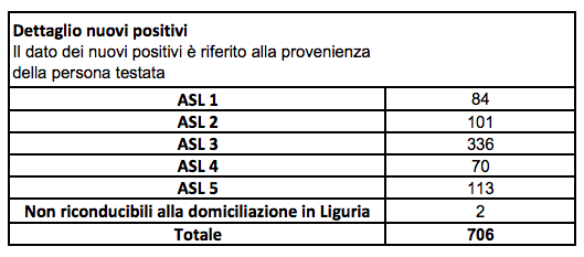 In Liguria i nuovi positivi sono 706 (ieri erano 156). Ecco il dettaglio dei nuovi positivi riferito alla residenza della persona testata: