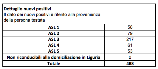 In Liguria i nuovi positivi sono 468 (ieri erano 479). Ecco il dettaglio dei nuovi positivi riferito alla residenza della persona testata: