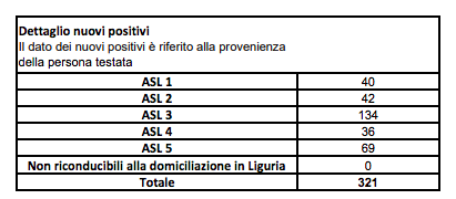 In Liguria i nuovi positivi sono 321 (ieri erano 447). Ecco il dettaglio dei nuovi positivi riferito alla residenza della persona testata: