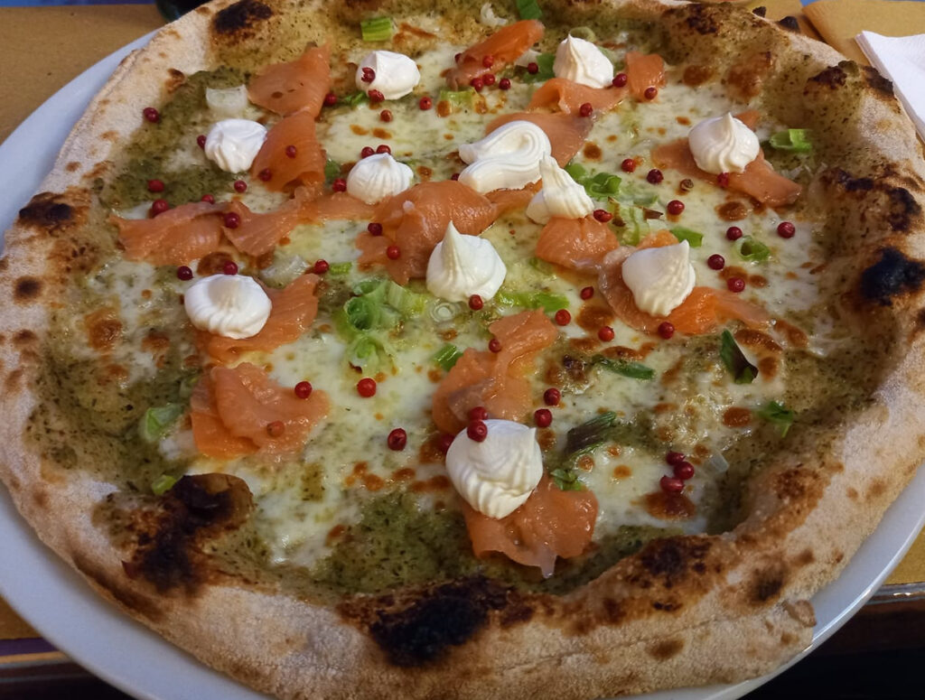 - Controcorrente: crema di zucchine, mozzarella, salmone affumicato, cipollotto, gocce di mascarpone, pepe rosa