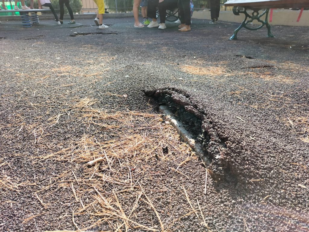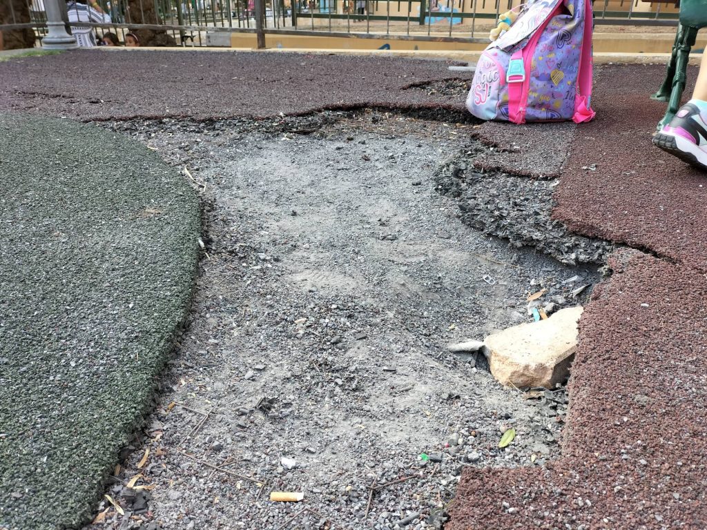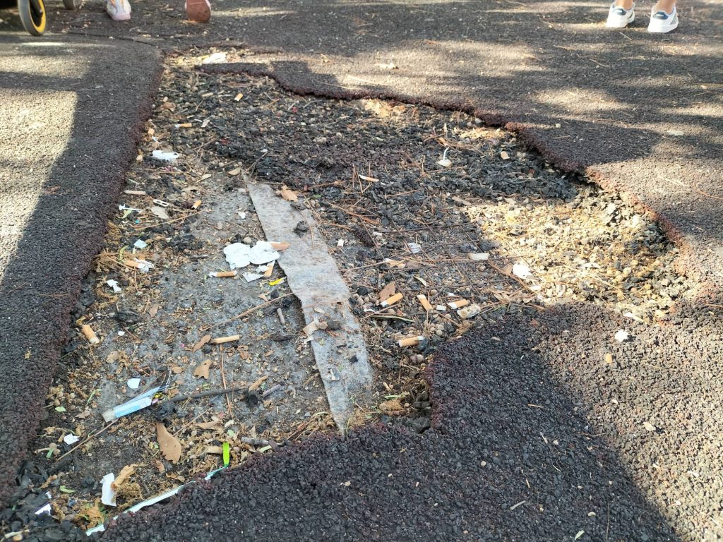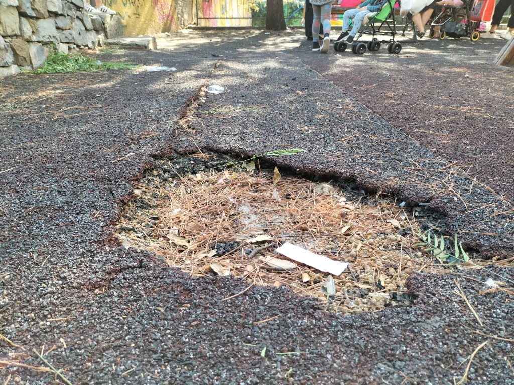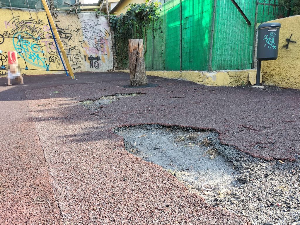 A destare più preoccupazione è il pavimento in gomma, quasi completamente distrutto. Come si può vedere dalle immagini, infatti, sono presenti buchi anche profondi un po’ ovunque e numerosissimi avvallamenti, molto pericolosi per i bambini che ogni giorno frequentano il parco. Oltre alla pavimentazione e ad alcuni giochi rotti, a preoccupare le mamme è anche l’assenza di pulizia.